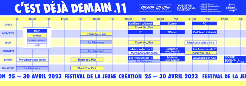 Le Théâtre du Loup, le Théâtre Saint-Gervais Genève, L’Abri et Le Grütli – Centre de production et de diffusion des Arts vivants se remettent ensemble afin de concocter un programme dense, éclectique et prometteur pour la 11ème édition du festival qui se tiendra du 25 au 30 avril 2023.